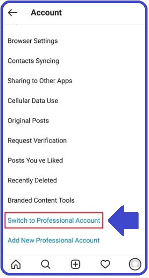 - دکمه Switch to Professional Account ممکن است در بخش Settings & Privacy باشد.